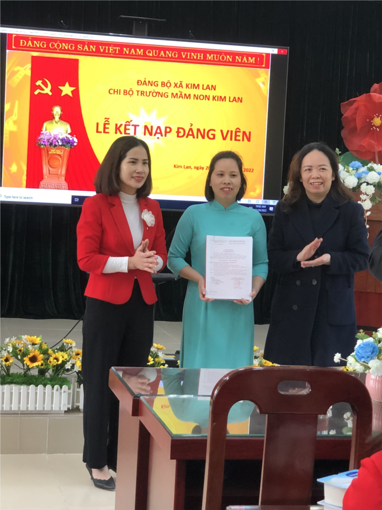 Ngày 20/12/2022 được sự đồng ý của Đảng ủy xã Kim Lan, Chi bộ trường mầm non Kim Lan long trọng tổ chức Lễ kết nạp đảng viên cho quần chúng Khúc Thị Thúy Huyền. Về dự và chỉ đạo hội nghị có đ/c Đào Thị Hồng Hải - Phó Bí thư Đảng ủy xã- Chủ tịch HĐND. Tại hội nghị đồng chí Bí thư chi bộ nguyễn Thị Hoài Giang đã đọc Quyết định kết nạp, giao nhiệm vụ và phân công đảng viên chính thức giúp đỡ đảng viên mới Khúc Thị Thúy Huyền. Đảng viên mới đứng dưới cờ đọc tuyên thệ và xin hứa thực hiện tốt chức trách và nhiệm vụ của người đảng viên. Dưới đây là một số hình ảnh