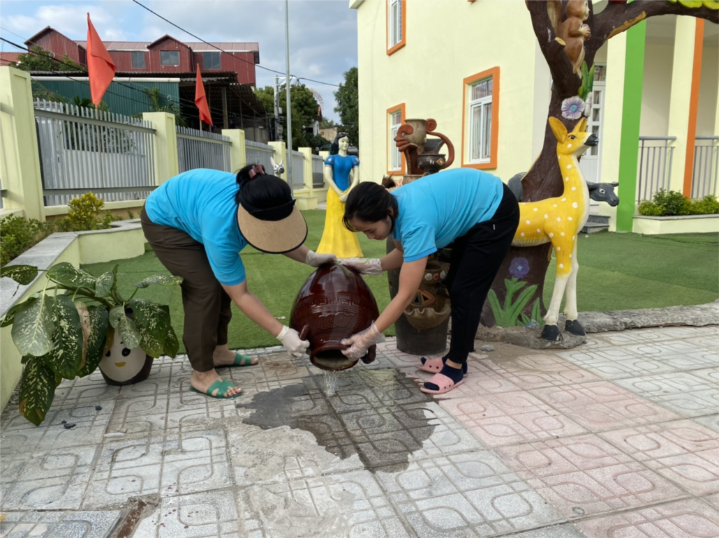 Để phòng chống dịch sốt xuất huyết công việc tổng vệ sinh bao gồm: kiểm tra, rà soát loại bỏ các vận dụng chứa nước, những nơi sống trú ngụ của bọ gậy, loăng quăng, muỗi và các con vi khuẩn khác…các hoạt động đã được thực hiện theo đúng kế hoạch nhà trường đề ra. Chiến dịch vệ sinh môi trường được CBGVNV nhà trường thực hiện nghiêm túc, khẩn trương, đảm bảo khối lượng công việc, các khu vực cống rãnh, bờ hàng rào đều được xử lý và quét dọn sạch sẽ..