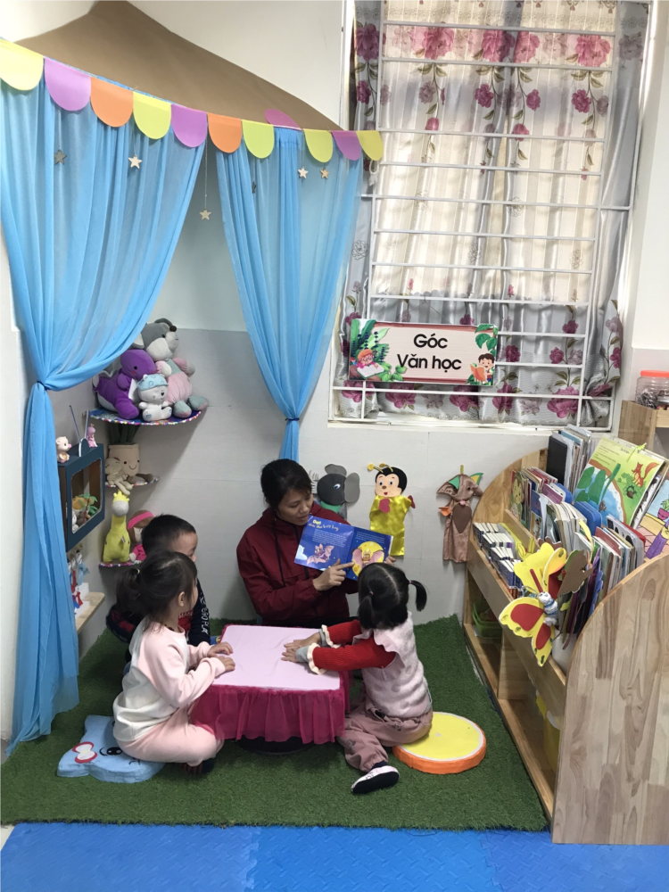 Do đúng tâm lý, tranh mình vẽ, mình tự tạo nội dung câu chữ dưới dạng kể lại, các bé đều phấn khởi khi đến giờ "đọc sách".