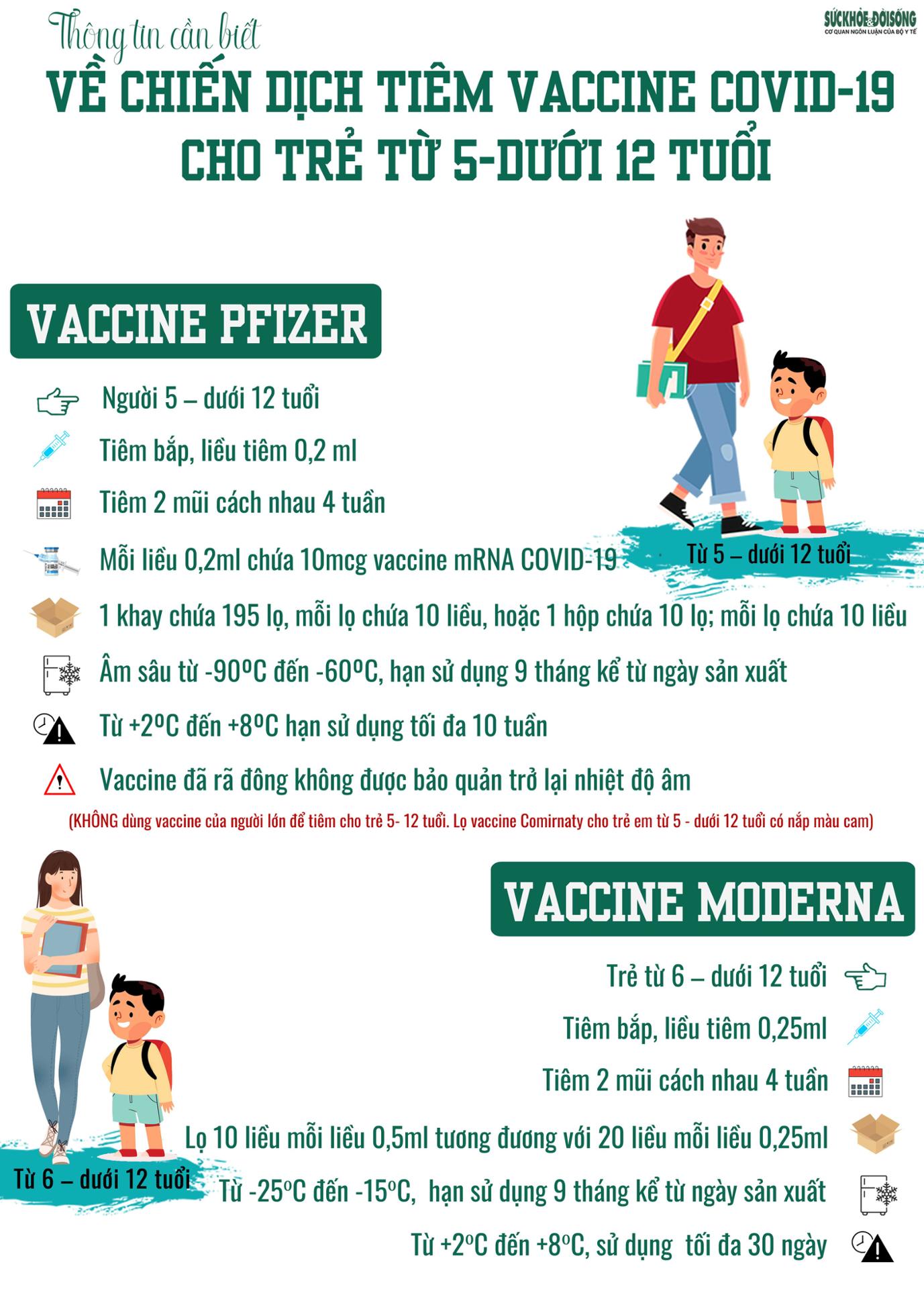 Theo đó, có 2 loại vaccine là: Vaccine Moderna và Vaccine Pfizer sẽ tiêm cho trẻ từ 5 - dưới 12 tuổi. Tuy nhiên, về liều tiêm mỗi mũi của 2 loại vaccine khác nhau, lứa tuổi tiêm cũng có sự khác biệt. Sau đây là những thông tin về 2 loại vaccin này.