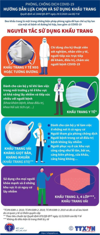 Bộ Y tế đã ban hành Quyết định số 1444/QĐ-BYT ngày 29/3/2020 về việc hướng dẫn tạm thời về lựa chọn và sử dụng khẩu trang trong phòng chống dịch COVID-19. Hướng dẫn này dành cho các chuyên gia y tế công cộng, phòng ngừa và kiểm soát nhiễm khuẩn, nhà quản lý, nhân viên y tế và cộng đồng. Hướng dẫn sẽ được sửa đổi khi có thêm dữ liệu.