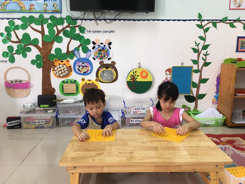 Trẻ tham gia vào các góc chơi ở lớp như: Góc phân vai; Góc kỹ năng tự phục vụ; Góc nghệ thuật (Âm nhạc - Tạo hình); Góc thiên nhiên; Góc học tập - khám phá; Góc sách truyện…Ở mỗi góc chơi trẻ đều được học những kiến thức, kỹ năng khác nhau và quan trọng hơn cả là trẻ có cơ hội được thể hiện mình và biết phối hợp cùng các bạn tham gia các hoạt động.
