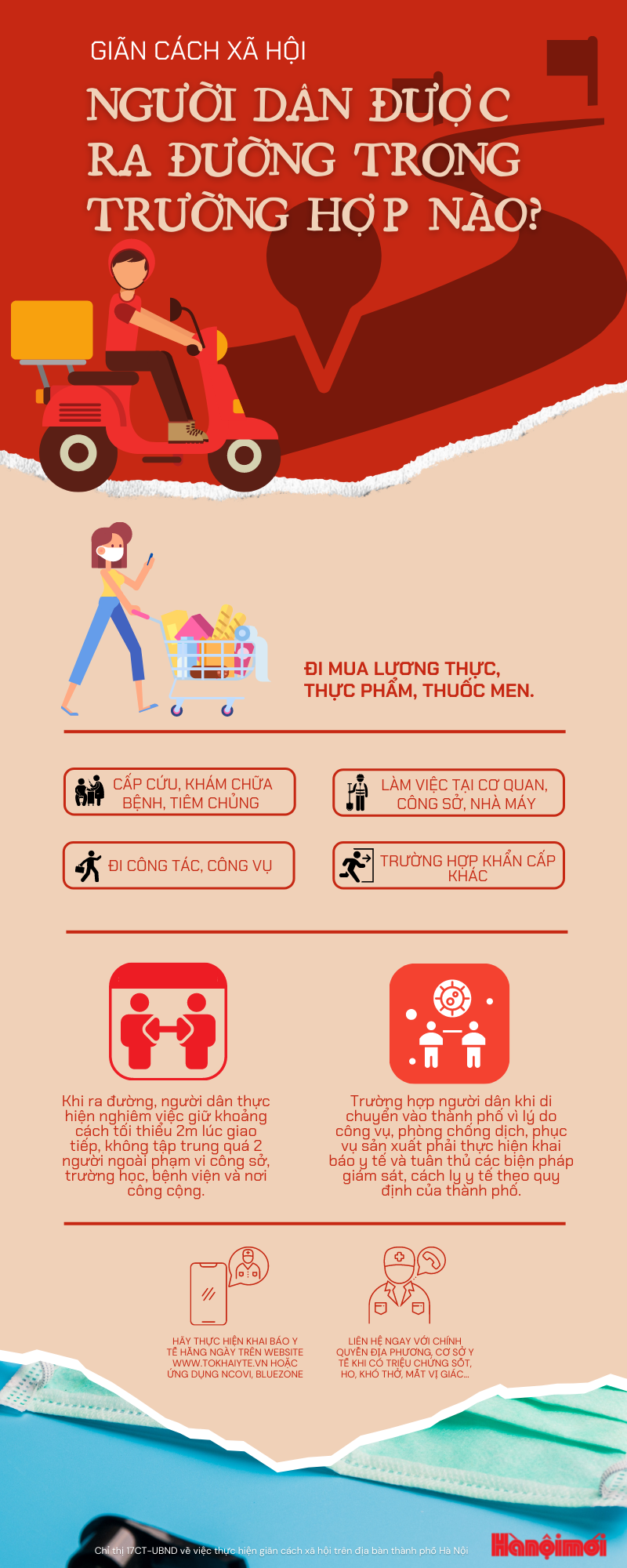 Theo nội dung Chỉ thị 17/CT-UBND của Chủ tịch UBND thành phố Hà Nội ký ngày 23-7 về việc thực hiện giãn cách xã hội trên địa bàn thành phố để phòng, chống dịch Covid-19, các trường hợp sau người dân sẽ được ra đường: